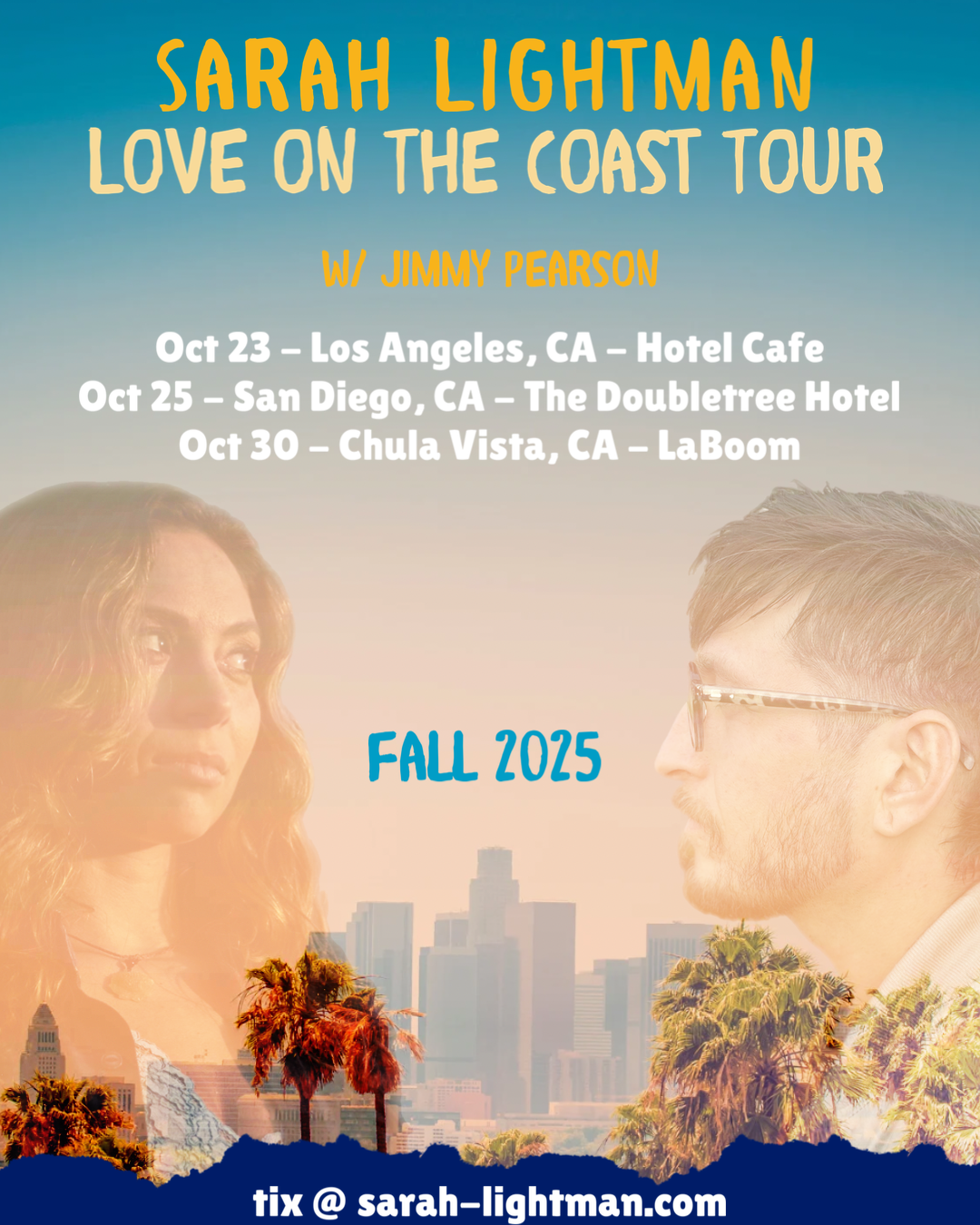 The tour is focused on community, and how we empower each other through connection and meaningful interaction. This past year has carried a lot of difficult ups and downs in Southern California, and we aim to bring a bit of so-cal sunshine back to the coast. Join us for an unforgettable night of soulful live music - I’ll be bringing the band too!